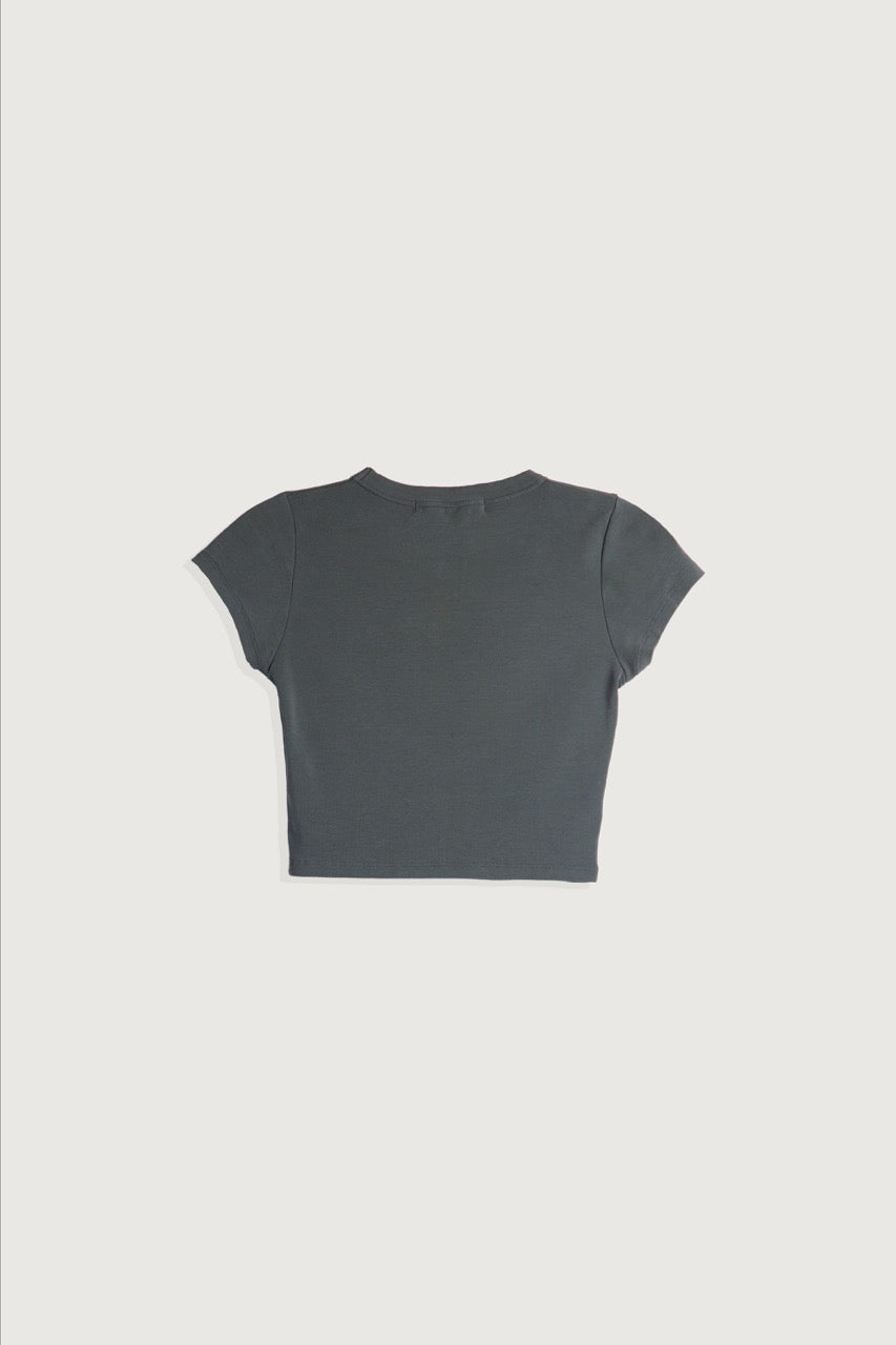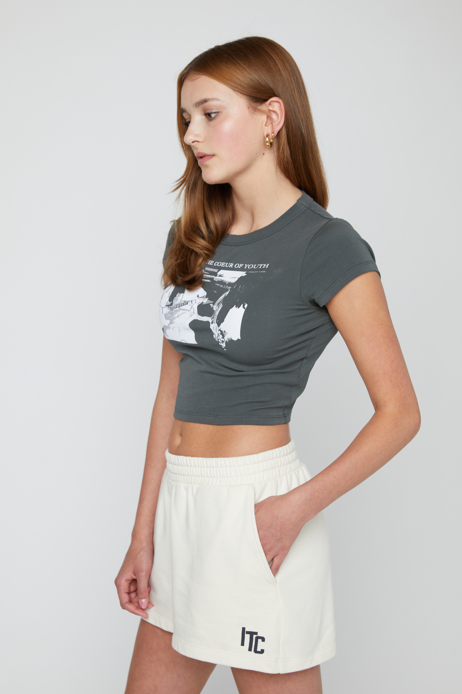 This Charcoal "COEUR OF YOUTH" Babydoll Tee is designed to be soft, stretchy, and comfortable. It comes in 4 sizes and 2 colours - charcoal and white - so you can find the perfect fit. Its cropped length makes it perfect for a casual, cool look. It has a meaningful design, with co-founders (Aru and Leah) playing guitar printed on the front as well as the accompanying words "EXPRESS THE COEUR OF YOUTH".