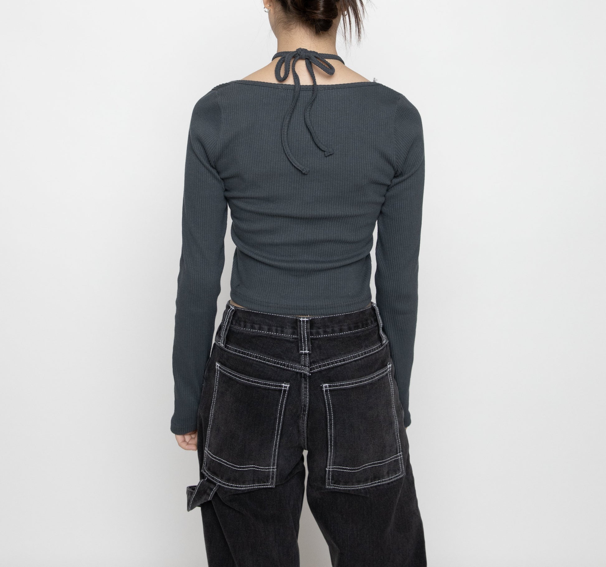 This ribbed, charcoal coloured long sleeve top is tight fitted and breathe-able with a square neck. It suits both a casual and elegant style and its strings can be tied in various ways.